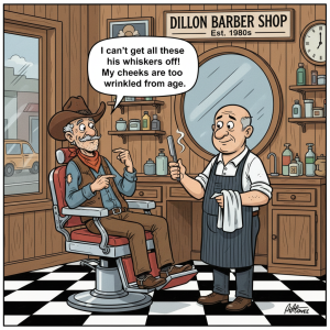 We hope this will give you a good laugh. An old cowboy walks into a barbershop in Dillon, Montana for a shave and a haircut. He tells the barber he can’t get all his whiskers off because his cheeks are wrinkled from age.